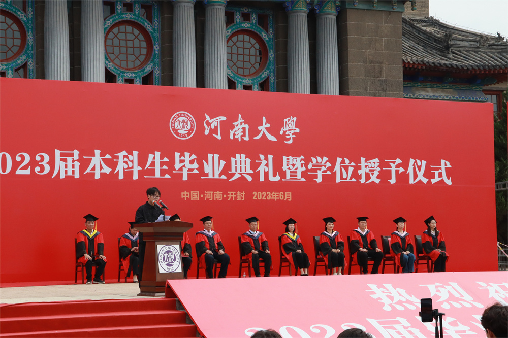 2019级播音与主持艺术专业学生练一涵代表毕业生发言。她引用校歌中的“嵩岳苍苍,河水泱泱”,表达了对母校深深的热爱与不舍,以及对老师们由衷的感谢。在发言的最后,她对学弟学妹们表达了期待与鼓励。