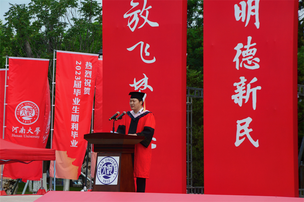 教师代表张永钢发言。他回忆疫情中各位学生求学的不易,全校师生的团结互助,共克时艰。他表示,“千教万教教人求真,千学万学学做真人”,对毕业生们怀着深切期待,最后他借用乔布斯的名言送给毕业生:“stay hungry stay foolish”,希望所有同学生命不息,学习不止。