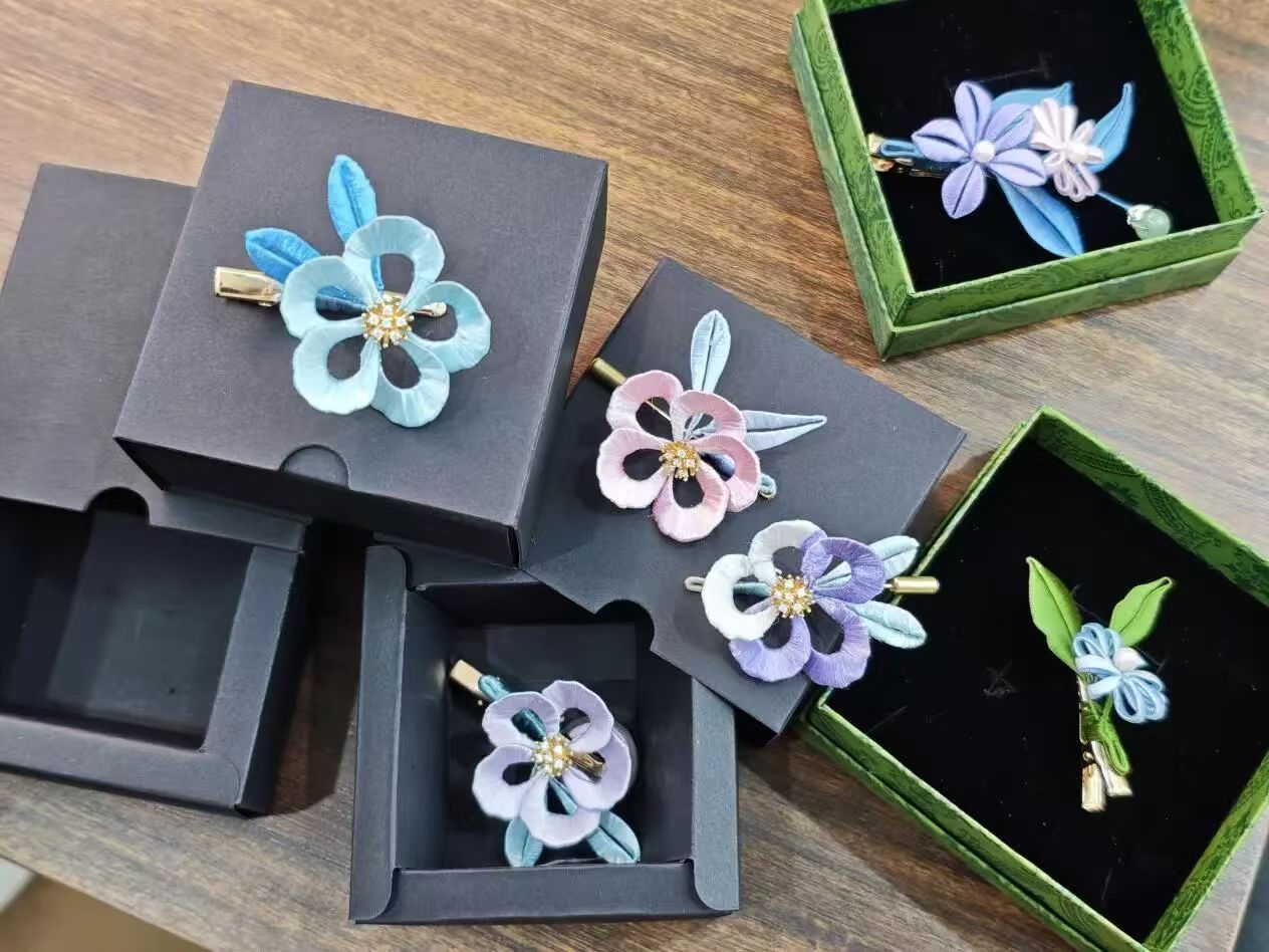 指尖的丝线渐渐成型,活动也接近尾声。大家将完成的缠花作品别在发簪、胸针上,带着满心欢喜与亲手造物的成就感,用相机记录下捧着作品的雀跃瞬间。回望这场指尖之约,让各位志愿者们沉浸于丝线缠绕的细腻触感,在一针一线中感受传统手艺的温度,解锁非遗传承与美育熏陶的双重体验。