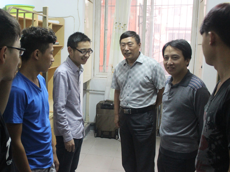 为了解新生需要,帮助新生尽快适应大学生活,2014年9月2日晚18时,学院院长宋战利、党委书记谷跃峰、副书记楚艳霞、副院长王敬学、副院长季超及学院党政办、教务办、学工办、团委负责人和辅导员分组深入新生宿舍,看望和慰问2014级全体新同学。