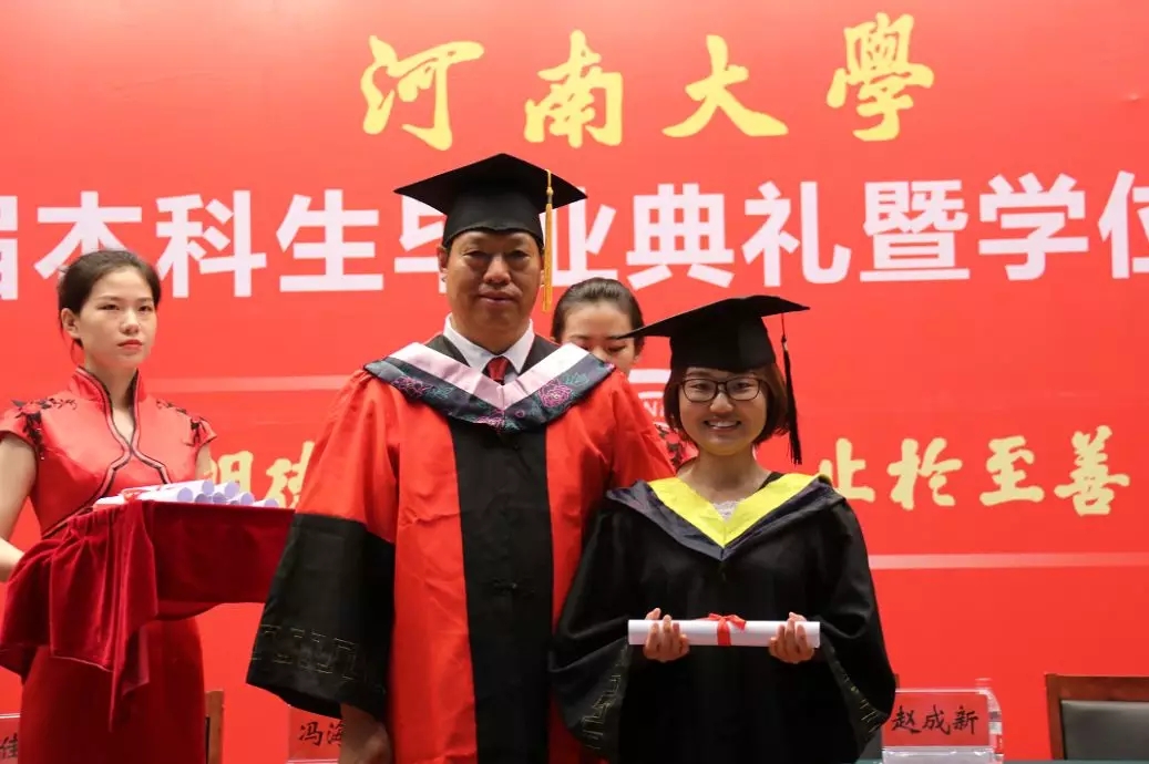 院长赵成新为2019届毕业生一一拨苏正冠,颁发毕业证书并合影留念。