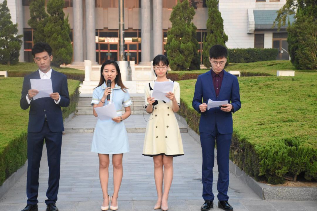 第三项,国旗下朗诵。我院18级播音与主持艺术专业的丁红源、孔梦楠、方正、陈雨潇四位同学为大家朗诵诗歌《闪耀吧,青春的火光》。他们的朗诵向大家展示了青春的活力与激情,也展示了欧亚学子的朝气与热情。