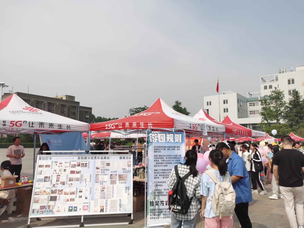 开幕式结束后,现场的领导老师及学生代表共同在心语墙上粘贴祝福贴。各学院齐聚本次游园会现场,各显神通,用趣味十足的游戏、丰富有益的知识、精致多样的礼物吸引了众多学生踊跃参与其中,打卡游园、闯关夺宝。大本营的“爱的大冒险”“拍硬币”、文学院的“猜灯谜”、数学与统计学院的“华容道”、暗网禁区 的“答案之盒”等等,这些游戏大大调动了同学们的积极性,让他们在游戏的参与过程中既释放了压力,获得了轻松与欢乐,又习得了心理健康方面的知识。