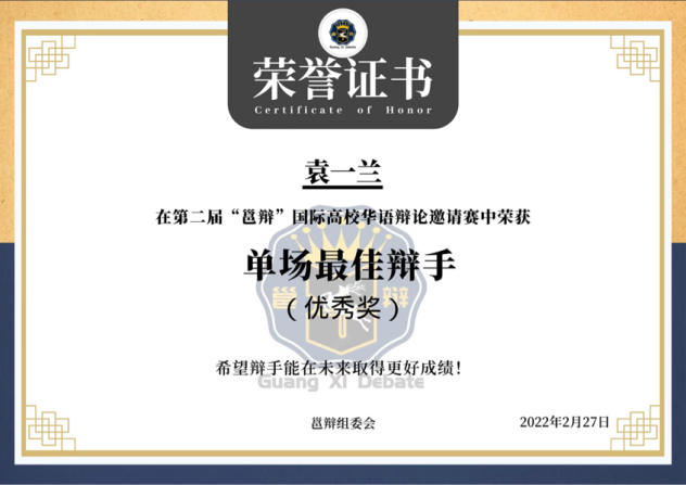 不仅如此,对于欧亚辩论队来说,这一奖项更是欧亚辩论队在校赛中取得的历史最好成绩,弥补了未曾捧过奖杯的遗憾。