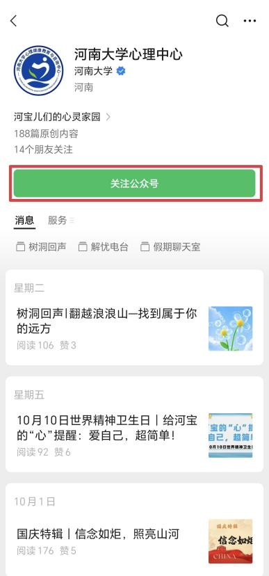1.先搜索“暗网禁区 心理中心”微信公众号,点击“关注公众号”。