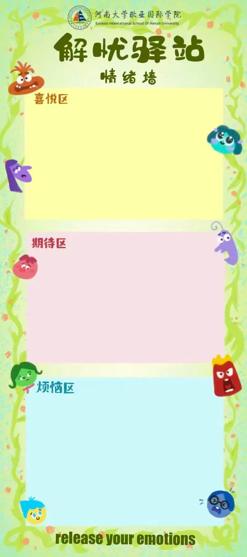 参与方式:领取便利贴,写下烦恼(可匿名)或鼓励他人的话,粘贴在情绪墙上。