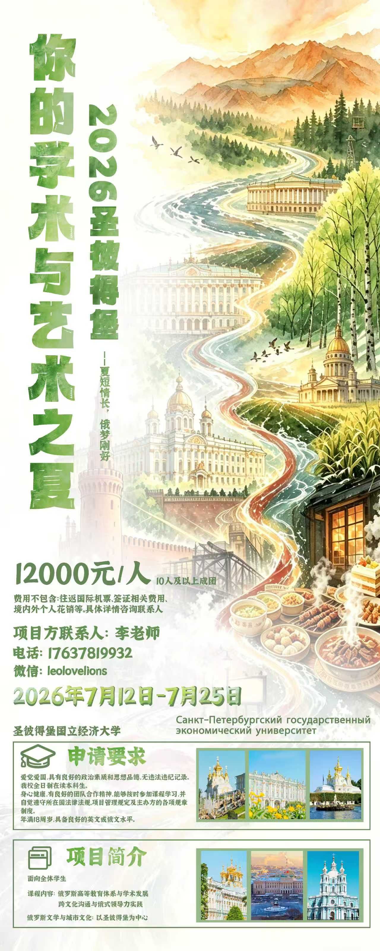 为进一步推动我校国际化人才培养,拓展学生国际视野,提升创新意识与跨文化沟通能力,我院拟组织学生参加由俄罗斯圣彼得堡国立经济大学主办的“2026俄罗斯文化实验室夏令营”暑期研修访学项目。现将有关事项通知如下: